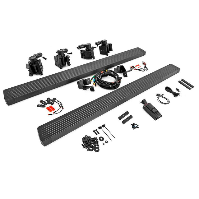 Instalación. Estos escalones fáciles de instalar son la solución perfecta para entrar y salir de su vehículo. No se requiere perforar para la instalación y los escalones se guardan firmemente debajo del panel de balancín cuando no se usan. No luche más para entrar y salir de su vehículo. Haga la vida más fácil con los estribos eléctricos de Rough Country.