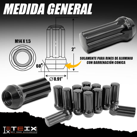 TUERCAS BIRLOS 14X1.5 24PZ SEGURIDAD TEIX OFF ROAD NEGROS
