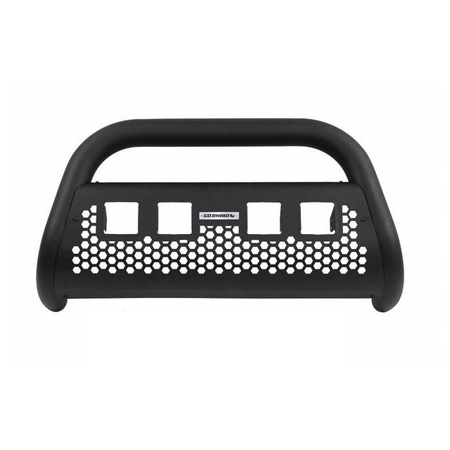 La serie RC2 LR de GO RHINO ofrece estilo con un diseño innovador y faros auxiliares integrados. El acabado texturizado en pintura negra electrostática y el emblemático patrón hexagonal de la parrilla realzan el estilo del vehículo.